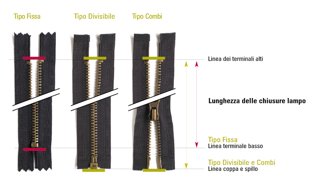 La lunghezza delle chiusure lampo finite si determina dalla misura che intercorre tra i terminali alti e il terminale basso per le fisse, e tra i terminali alti, coppa e spillo per le divisibili e le combi. È prevista una tolleranza sulle lunghezze pari al 2% circa. I modelli e le caratteristiche descritti nel catalogo possono variare senza preavviso.